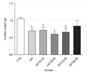 Cardiac weight: When compared to the control group, the administration of both non-irradiated and gamma-irradiated Solanum lycopersicum at different radiation doses significantly decreased cardiac weight (p<0.05, Fig. 1). Rats given FBT80/50 did not, however, exhibit a discernible difference in heart weight when compared to the control group.