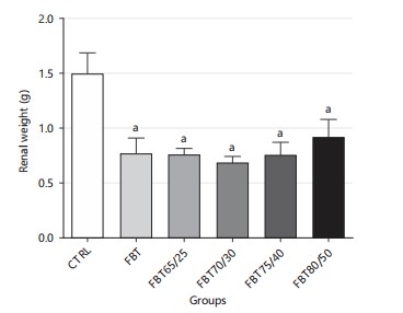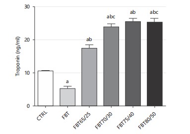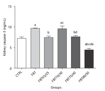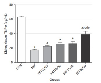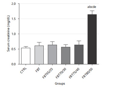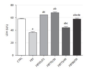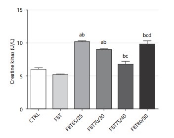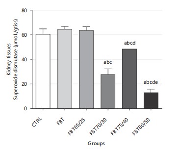 Values are Mean±SEM, (a) Significantly (p<0.05) when compared to CTRL, (b) Significantly (p<0.05) when compared to FBT, (c) Significantly (p<0.05) when compared to FBT65/25, (d) Significantly (p<0.05) when compared to FBT70/30 and (e) Significantly (p<0.05) when compared to FBT75/40 |