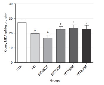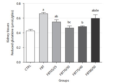 FBT80/50, significantly decreased kidney tissue GSH activity compared to the FBT group. Rats treated with FBT70/30 exhibited significantly lower GSH activity than those treated with FBT65/25 among the irradiation groups. A possible dose-dependent recovery of antioxidant function at higher irradiation levels is suggested by the fact that rats treated with FBT80/50 showed higher GSH activity in their renal tissues than rats treated with FBT70/30 and FBT75/40 (Fig. 7).
