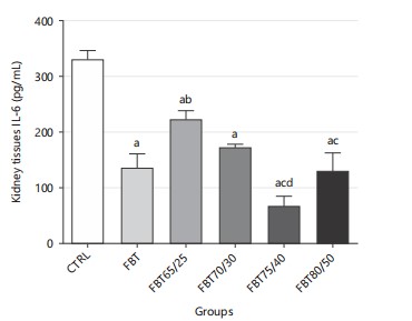 Kidney cytokines interleukin-6: Rats treated with both non-irradiated (FBT) and gamma-irradiated Solanum lycopersicum showed considerably lower levels of interleukin-6 (IL-6) in kidney tissue than the control group. The FBT65/25 group, however, had a noticeably larger concentration than the FBT, FBT75/40, and FBT80/50 groups, indicating a considerable variation in IL-6 levels between treatment groups (Fig. 9).