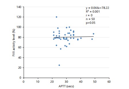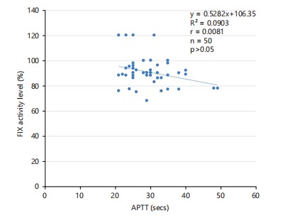 Table 4 shows Hct, APTT, factor VIII, and activity levels of blood donors based on age range. The Mean±SD of Hct, APTT, and FVIII activity level of blood donors aged 15-25 years was (0.415L/L±2.95, 31.23 sec±5.03, 79.50%±10.68, and 90.4%±8.81), 26-35 years (0.423L/L±2.54, 28.69 sec±7.75, 81.00%±16.53, and 90.9%±14.4) and 36-45 years (0.414L/L±2.97, 27.20 sec±3.70, 79.40%±4.97, and 90.8%±3.03), respectively. This shows that there was no significant difference (p>0.05) in the age range. Table 5 shows Hct, APTT, and factor VIII activity level of blood donors based on gender. In Hct, male was (0.42L/L ±2.49 and female 0.38L/L±1.60), APTT was (29.34 sec±6.56 and 32.00 sec±5.01), FVIII activity level (80.61%±13.79 and 77.00%±7.48), and FIX activity level was (90.8%±11.9 and 89.2%±3.37). It was observed that there was a significant difference (p>0.05). Table 6 shows Hct, APTT, and FVIII activity level of blood donors based on frequency of donation. In Hct, APTT, and FVIII activity level of first-time donors were (0.41L/L±2.64, 29.57 sec±5.36, 79.72±14.88, and 90.6±9.79), second-time donors (0.41L/L±1.88, 29.20 sec±7.75, 79.90%±11.23, and 87.4%±10.0), and third-time donors (0.42L/L±4.18, 30.71sec±9.49, 82.71%±6.55, and 95.7%±18.0), respectively. It shows that there was no significant difference (p>0.05). Table 7 shows Hct, APTT, and FVIII activity level of blood donors based on alcohol intake. There was a significant decrease (p<0.05) in APTT parameters of blood donors on alcoholic intake (28.29 sec±8.58) than those not on alcohol (30.36 sec±4.96). Hct, FVIII, and FIX activity levels show no significant difference (p>0.05) in alcoholics and non-alcoholics (0.42L/L±3.32 and 0.41L/L±2.43), (81.29%±7.74 and 79.60±15.35), and (90.7%±13.3 and 90.7%±10.3), respectively. Correlation graphs between APTT versus FVIII and APTT versus FIX activity levels of blood donors were shown in Fig. 1-2. It was observed that there was no significant (r=0, p>0.05, r=0.0081, p>0.05) correlation between APTT vs FVIII and APTT vs FIX activity levels in the study.