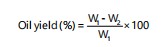 About 200 g of orange peel was placed into the thimble and placed in the Soxhlet chamber8. A 1500 mL of N-hexane were placed in a round-bottom flask and assembled for the Soxhlet extractor, then the distillation process was begun. After completing the extraction process, the solvent and extractor were placed in a water bath to evaporate the solvent. The extracted orange peel oil was weighed by using the following equation: