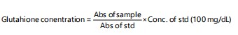 Determination of reduced glutathione (GSH): This was based on the method of Jollow et al.14. Briefly, a volume of the sample (0.1 mL) was mixed with 0.9 mL of the distilled water in a beaker. The 1 mL of 2% sodium sulphate was also added. This was followed by the addition of 0.02 mL of 20% lithium sulphate, 0.2 mL of 20 % Na2CO3 and shaken vigorously. Then, 0.2 mL of phospho-18-tungstic acid was added inside. The absorbance was measured at 450 nm: