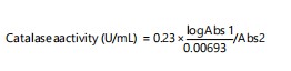 Assay for catalase activity: The activity of catalase was assayed according to the method of Aebi16. Briefly, 2 mL of hydrogen peroxide and 2.5 mL of phosphate buffer were added to a beaker. Subsequently, 0.5 mL of the sample was also added and mixed. Then, 1 mL portion of the reaction mixture was added to 2 mL of dichromate acetic acid reagent. The absorbance was read at 570 nm at a minute interval into 4 places. Catalase activity was calculated using the following equation: