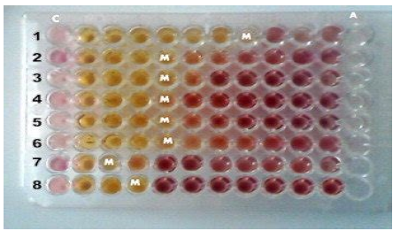 Concentration (MBC), 10 μL of the microorganism was inoculated into each microplate well and incubated at 37°C for 24 hrs. The least concentrations that showed no growth or turbidity were then streaked onto Nutrient Agar (N.A.), and the lowest concentration with no trace of growth was considered the MBC.