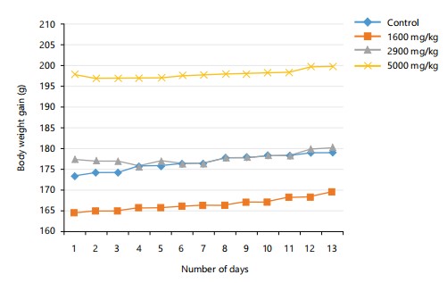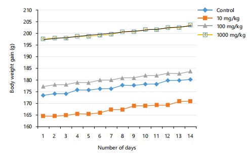 Acute toxicity (LD50): The acute oral toxicity test of the CMECNR revealed no observable toxicity or mortality in rats, even at a dose of 5000 mg/kg as presented in Table 1. Treated animals remained healthy, showing normal behavior and weight gain as shown in Fig. 1 and 2, comparable to the control group.